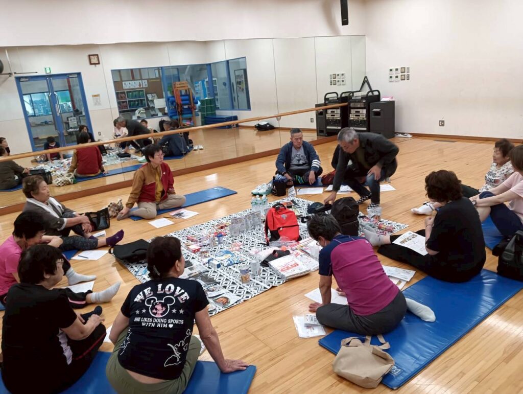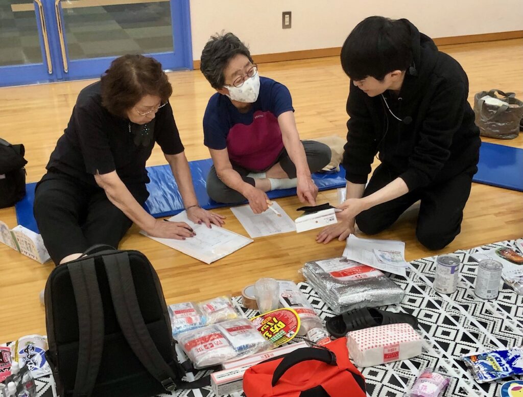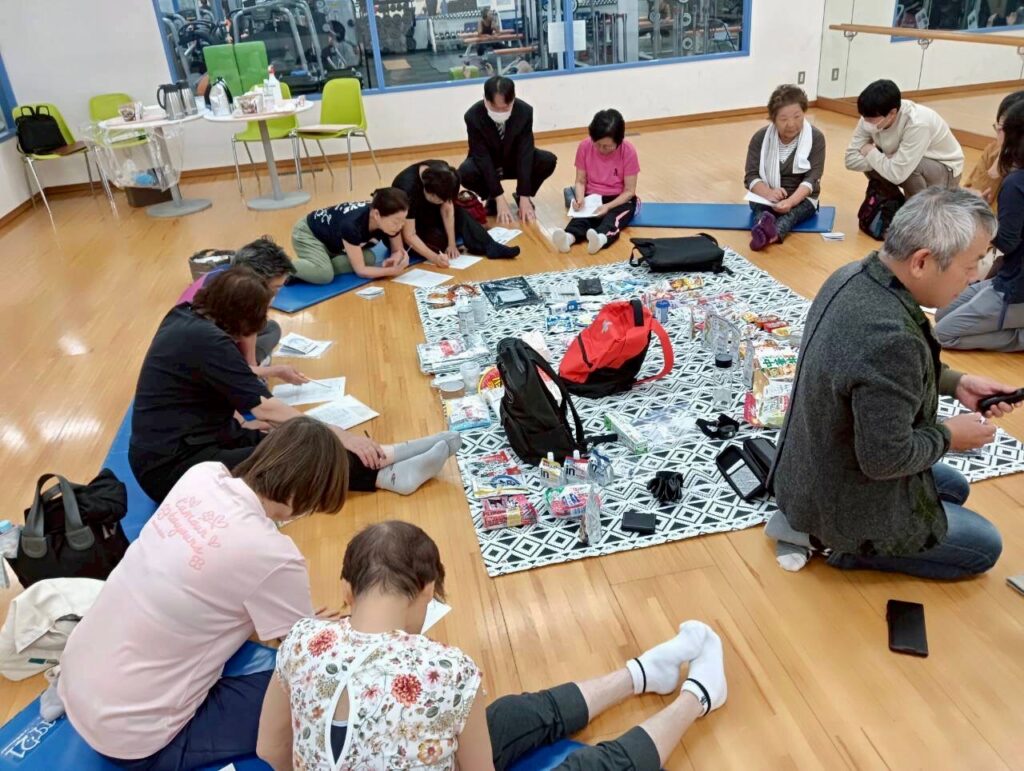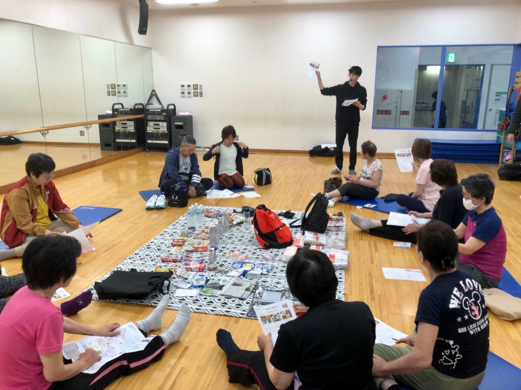 市販されている防災グッズのセットやローリングストック商品などを展示し、実際に見ていただきながら、災害時に避難する場合を想定して、持ち出し用リュックに何を入れるかを考えていただきました。