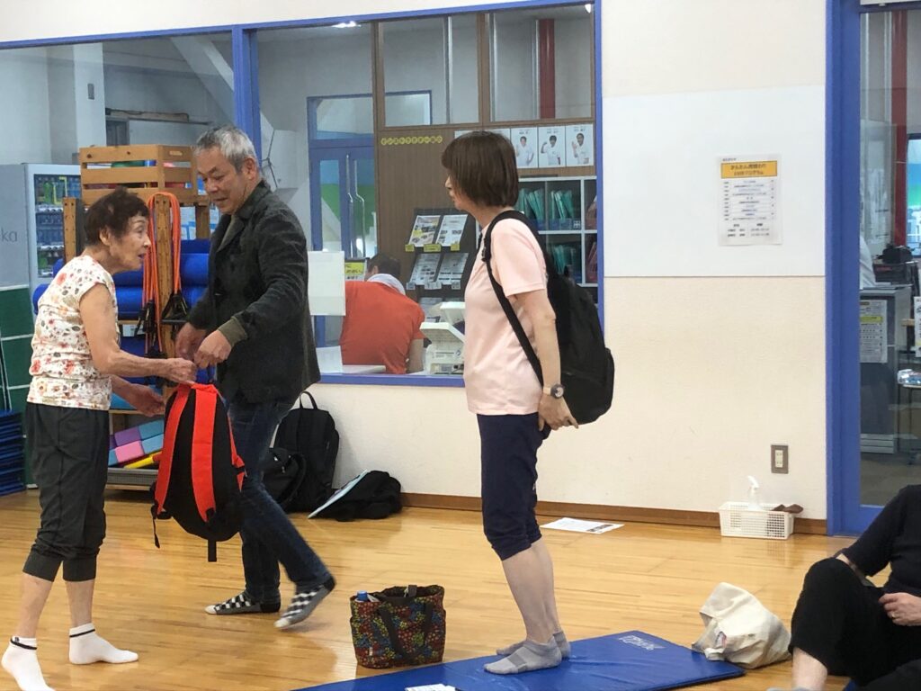 実際に重さの違うリュックを背負っていただき、いざという時に避難ができるかどうかを体験していただきました。