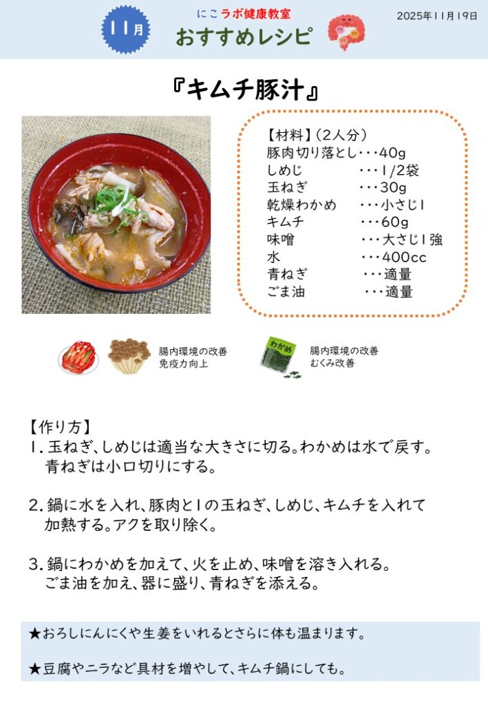 本日のおすすめレシピはキムチ豚汁。発酵食品のキムチに食物繊維を多く含むきのこ類や海藻類を使用しています。ごぼうなどの根菜類を入れてもおいしいですよ。