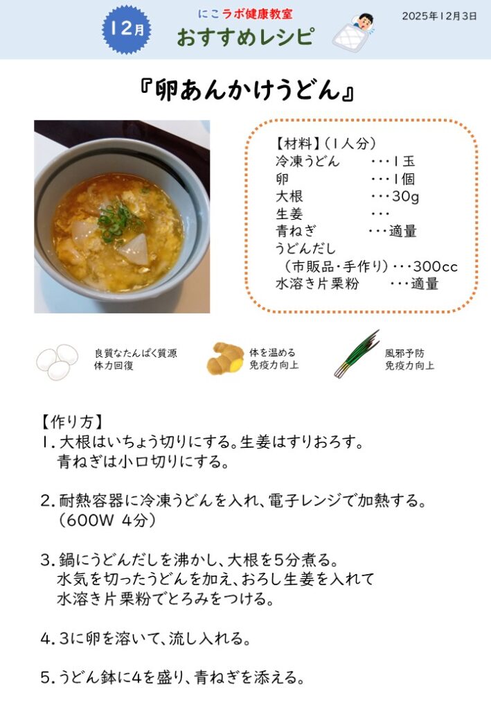12/3第九回にこラボ健康教室(第2クール) 2025年12月4日 12月3日(水)第九回にこラボ健康教室を開催致しました。今回は、『たかが風邪、されど風邪』がテーマです。 身近な病気の『風邪』について、タイプ別の特徴やおすすめの食材などを紹介しました。 今回のおすすめレシピは「卵あんかけうどん」です。風邪などで体調を崩した時や体を温めたいときにぴったりです。 本日の筋トレは、開眼片足立ちなど2種類を行いました。ちょっとした隙間時間にできる運動ですので、ぜひ毎日やってみてください。 本日のドリンクは、寒い冬におすすめの『しょうが湯』をご用意しました。ドリンクを飲んでいるときは、皆さん体も心もほっこりして、とても良い笑顔をされていました。弊社では「栄養」「身体活動」「社会参加」を組み込んだプログラム、「共食」をセットにしたレクリエーションサービスを提供し、健康寿命延伸の取り組みを共創しております。ご興味、ご関心がございましたらお気軽にお問合せください。お問い合わせ – FRev.株式会社(エフレボ株式会社)|食の未来図ニッコースポーツ様HPリンクhttps://nikko-sports.jp/index.htmlにこラボ健康教室様HPリンクhttps://nikko-sports.jp/taiken/2025_kenkou.html