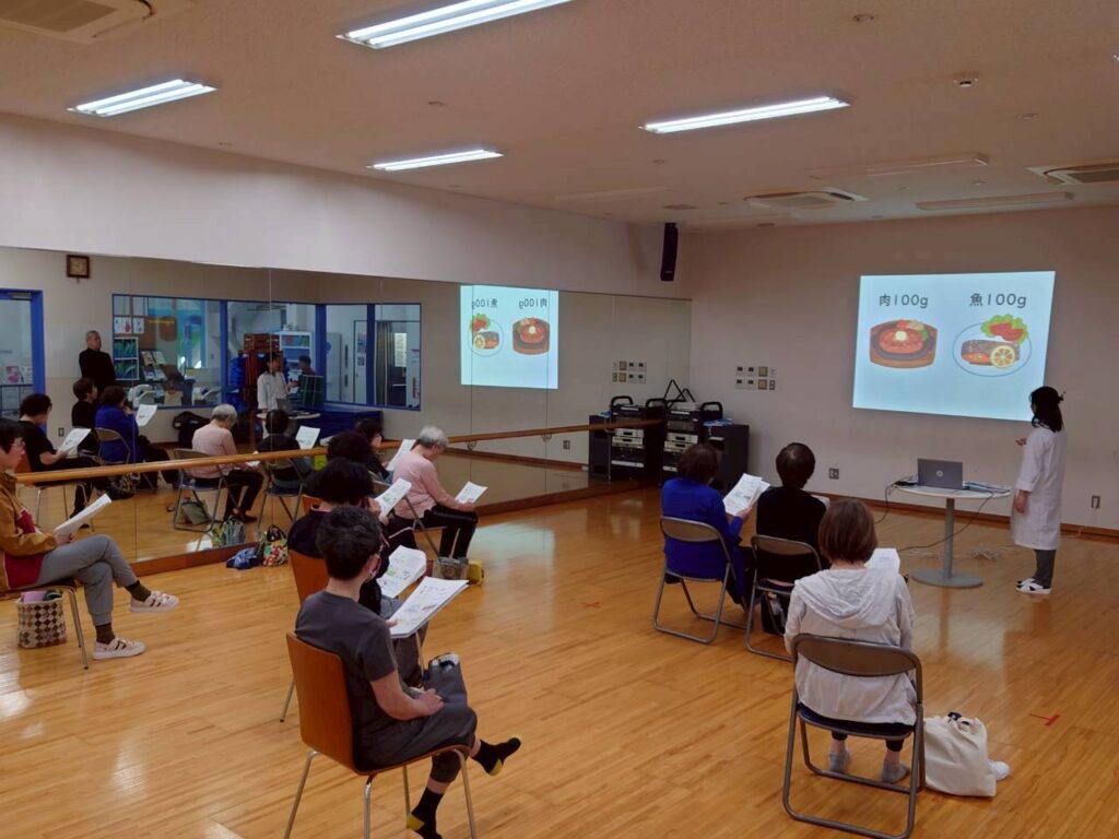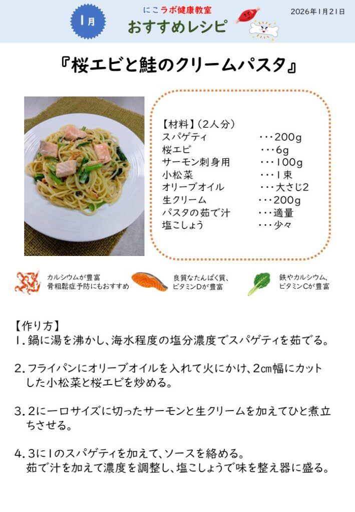 1/21第三回にこラボ健康教室(第3クール) 2026年1月22日 1月21日(水)第三回にこラボ健康教室を開催致しました。 今回は、『足腰を丈夫に』がテーマです。 何も対策をしなければ、筋肉量や骨量は加齢とともに低下していきます。いつまでも足腰を丈夫に維持していくには運動だけでなく食事も重要です。これまで学んだ事を復習しながら食事のポイントを学習しました。 今回のおすすめレシピは、「桜エビと鮭のクリームパスタ」です。たんぱく質やカルシウムを多く含む食材などを組み合わせたメニューです。普段の食事の中にも、主菜以外に副菜や汁物などにもたんぱく質やカルシウムの多い食材をちょっと意識して取り入れるように心がけてみましょう。 本日の筋トレは、椅子に座ってできる筋トレを行いました。楽しい雰囲気の中で皆様一緒に頑張ってチャレンジしました。 最後のお楽しみドリンクは、豆乳ベースの温かいドリンクです。ドリンクタイムは参加者やスタッフとの交流タイムにもなっています。弊社では「栄養」「身体活動」「社会参加」を組み込んだプログラム、「共食」をセットにしたレクリエーションサービスを提供し、健康寿命延伸の取り組みを共創しております。ご興味、ご関心がございましたらお気軽にお問合せください。お問い合わせ – FRev.株式会社(エフレボ株式会社)|食の未来図ニッコースポーツ様HPリンクhttps://nikko-sports.jp/index.htmlにこラボ健康教室様HPリンクhttps://nikko-sports.jp/taiken/2025_kenkou.html