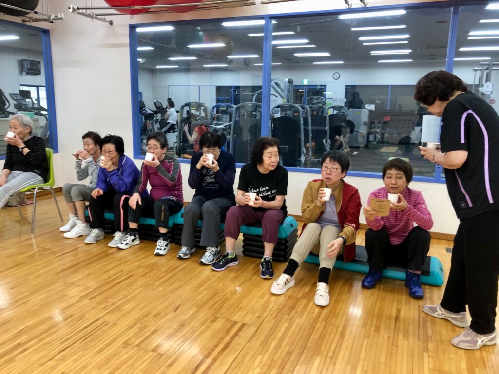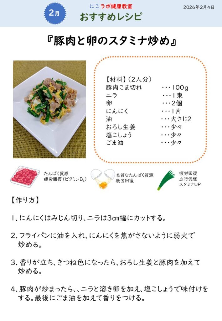 2/4第五回にこラボ健康教室(第3クール) 2026年2月5日 2月4日(水)第五回にこラボ健康教室を開催致しました。今回は、『若々しさをキープする体力づくり』がテーマです。若々しさを保つための体力づくりは、災害時に自分の命を守ることにもつながります。 災害時に自力で避難するためには普段からの体力づくりが大切です。災害が起きた場合、荷物を持って長距離を歩いたり、階段を昇り降りしたり、時には瓦礫の中を移動することも想定されます。今回は実際に重りを入れたリュックを担いで疑似体験を行いました。 まずは自分に合った重りを組み合わせてリュックに入れます。「災害時に水分を持って逃げるとしたら、この重さだとペットボトル4本だわ。」「この重さで長時間歩けるかしら?」「このくらいは持てるわ。」などと話しながら各自で重さを調節していました。中には手に重りを持つ方もいました。 準備ができたら、皆で教室の中を歩きます。途中、段差がいくつもあります。10分程歩いた頃には、皆さんじんわりと汗ばんでいました。 歩き終わった後は、本日のお楽しみドリンクタイム♪昨日は節分でした。小豆の赤色には魔除けの意味があり、「厄除けぜんざい」として関西地域では食べられる習慣があります。そこで、今回はそれにちなんで「あずき茶」を提供しました。 今回の体験を通じて、自身の体力の気づきや災害を自分の問題として考えるきっかけとなったのではないでしょうか。 本日のおすすめレシピは「豚肉と卵のスタミナ炒め」です。生のにんにくを炒めることがポイントです。皆さんからにんにくなどに関する質問が飛び交いました。いろいろな食材でアレンジができますので、ぜひお試しください。 弊社では「栄養」「身体活動」「社会参加」を組み込んだプログラム、「共食」をセットにしたレクリエーションサービスを提供し、健康寿命延伸の取り組みを共創しております。ご興味、ご関心がございましたらお気軽にお問合せください。お問い合わせ – FRev.株式会社(エフレボ株式会社)|食の未来図ニッコースポーツ様HPリンクhttps://nikko-sports.jp/index.htmlにこラボ健康教室様HPリンクhttps://nikko-sports.jp/taiken/2025_kenkou.html